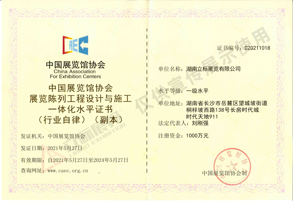 近日,湖南立標(biāo)展覽有限公司通過了中國(guó)展覽館協(xié)會(huì)的資質(zhì)等級(jí)評(píng)定,榮獲“中國(guó)展覽館協(xié)會(huì)展覽陳列工程設(shè)計(jì)與施工一體化水平證書”,水平等級(jí)為一級(jí)水平,并獲得由中國(guó)展覽館協(xié)會(huì)頒發(fā)的資質(zhì)證書。此次一級(jí)水平證書的獲得標(biāo)志著我司在展覽陳列水平等級(jí)方面又上了一個(gè)新的臺(tái)階,也說明我司在展覽展示空間藝術(shù)領(lǐng)域的作品得到了行業(yè)認(rèn)可。