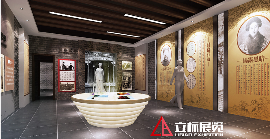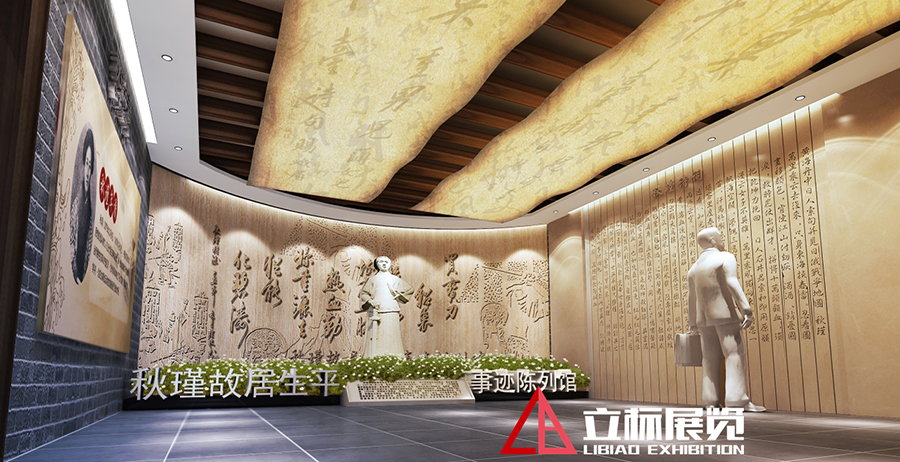 在展館的室內(nèi)設(shè)計中采用曲線、波浪、墻、弧形等流動的元素。在色彩色上以黑、白、灰為主基調(diào),借助展板,燈箱,造型,場景復(fù)原,浮雕雕塑與聲、光、電等現(xiàn)代的科技手法,并以動與靜、虛與實、冷與暖的藝術(shù)手段建立起展品與內(nèi)容間的內(nèi)在聯(lián)系,起到升華的主題,增強藝術(shù)感染力的作用,從不同方面展示秋瑾的一生。